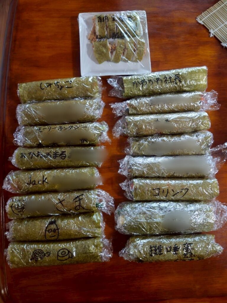 生魚食べられない生徒は他の具材をちょっと多く盛って何とか形に✨巻いたらどれが誰のか分からなくなりそうだったのでとりあえず名前を書きましたが、個性的なあだ名のつけ方w