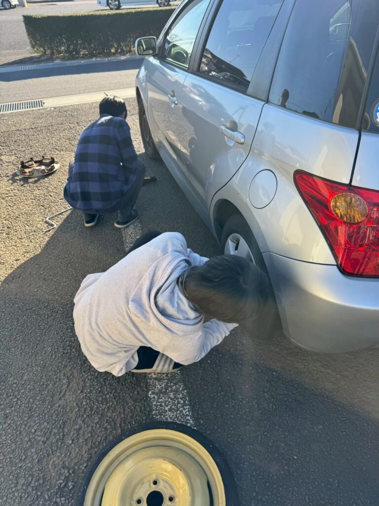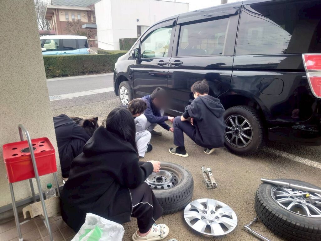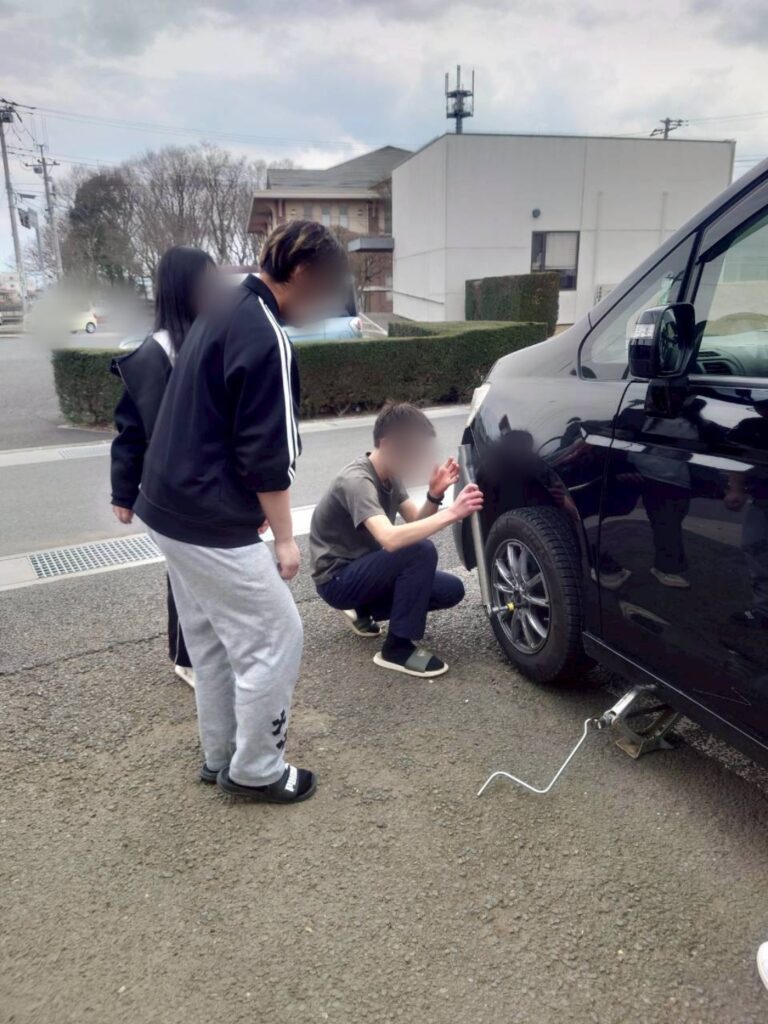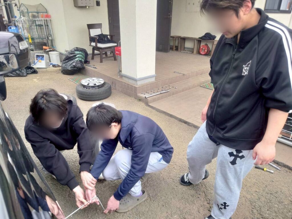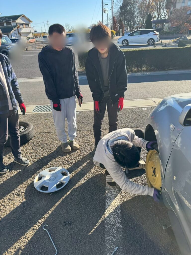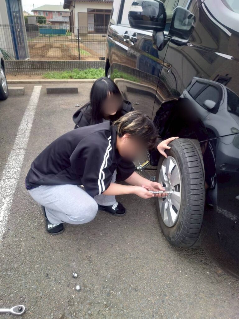 スタッフFさんの監修の元、タイヤ交換を生徒でやってみることに👍