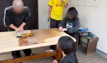 今リビングには大きなダイニングテーブルが3つ置いてあります😀みんなで食事したり、座学やゲームなどでも使う、所謂【何でもテーブル】でございます☝️さてさて、そのテーブルですが…前に彫刻刀を使って木を彫っている時に勢い余ってガスッと小…